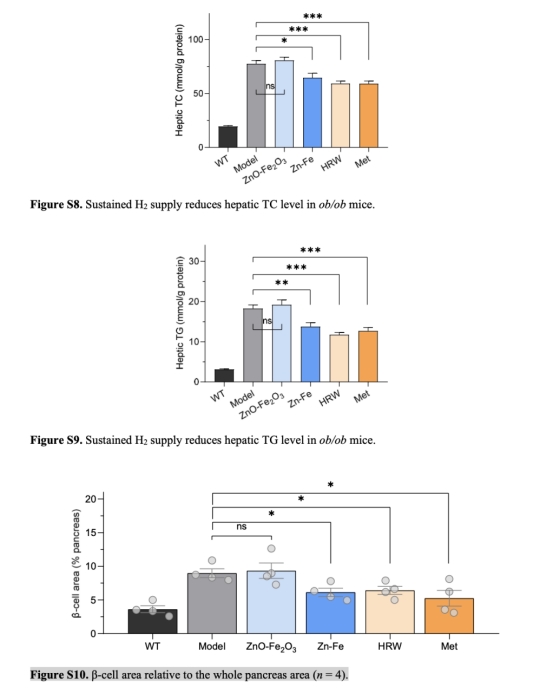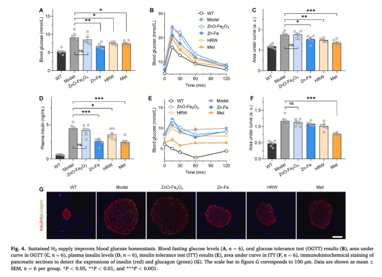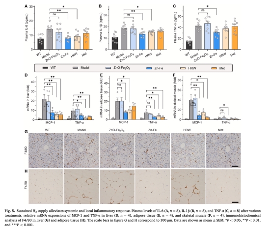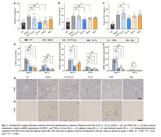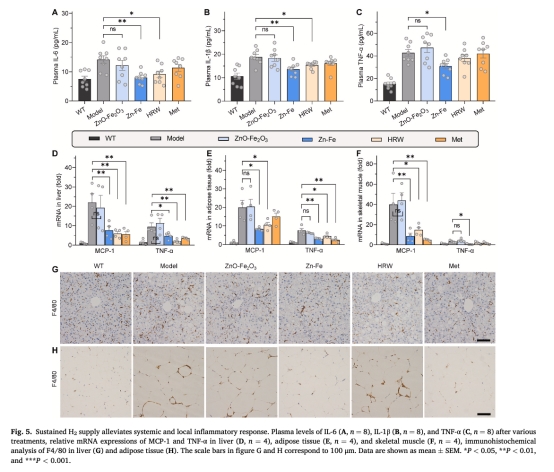 意義:數(shù)據(jù)證實(shí)Zn-Fe通過(guò)長(zhǎng)效H?遞送,同步改善多組織炎癥和IR,效果優(yōu)于富氫水。