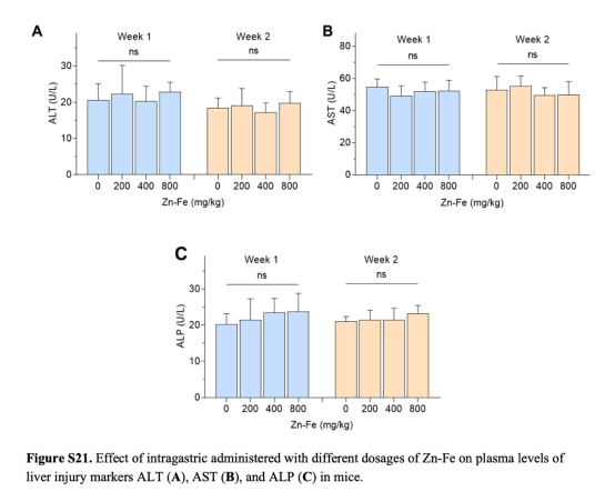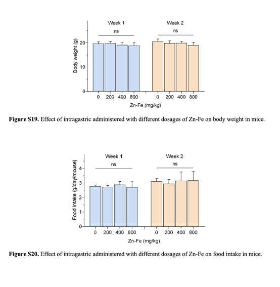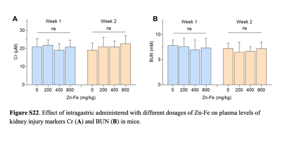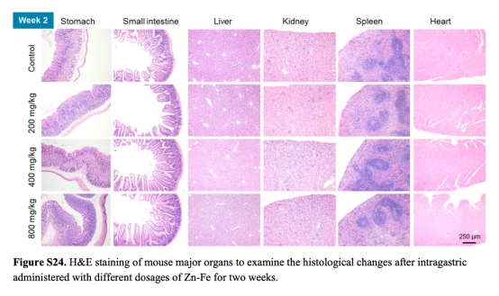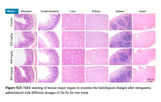 安全性:通過(guò)組織病理學(xué)和血液生化指標(biāo)評(píng)估高劑量Zn-Fe的毒性(圖S21-S24)。