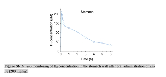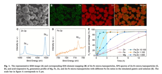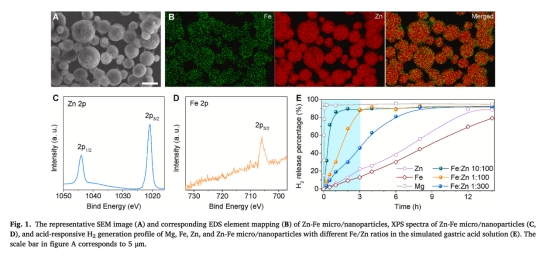 成功開發(fā)Zn-Fe原電池微納材料,通過(guò)調(diào)控Fe/Zn比例實(shí)現(xiàn)H?釋放速率與胃排空時(shí)間的匹配(約3小時(shí))。