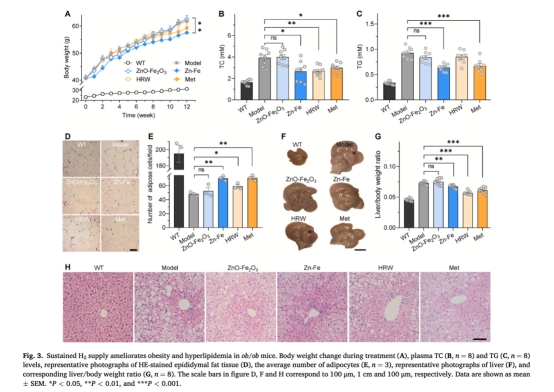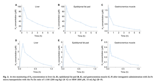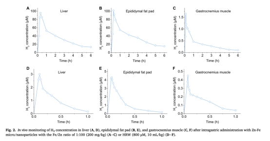 口服Zn-Fe后,肝臟和脂肪組織的H?峰值濃度達(dá)95.8μM和102.0μM(圖2A-B),是富氫水(HRW)的30倍以上(圖2D-E僅3.0–4.3μM)。