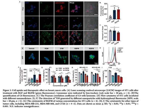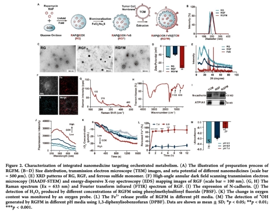 成功構(gòu)建仿生納米藥物RGFM,實現(xiàn)葡萄糖氧化酶高效負(fù)載(93.3%)及腫瘤靶向遞送。
