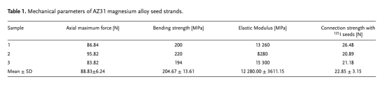軸向最大力(88.83±6.24 N)、彎曲強(qiáng)度(204.67±13.61 MPa)等參數(shù)證明AMASS具備臨床植入所需的機(jī)械強(qiáng)度,防止種子移位。