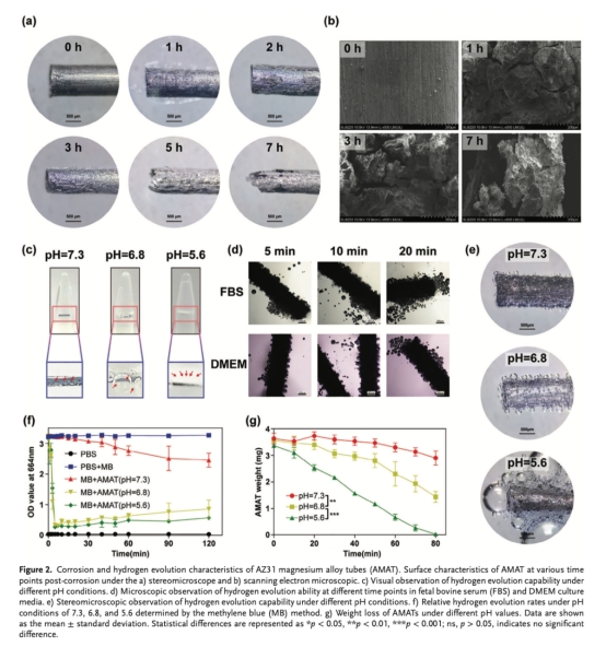 材料設(shè)計(jì)與表征:制備AZ31鎂合金管(AMAT)并與12?I種子組裝成AMASS,測(cè)試其力學(xué)性能(軸向力、彎曲強(qiáng)度等)和pH依賴的降解/產(chǎn)氫特性。