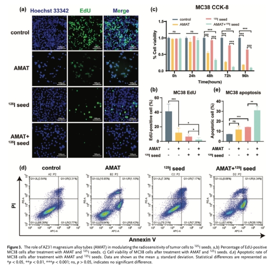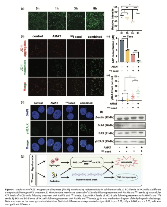 該研究開(kāi)發(fā)了一種名為AMASS(AZ31鎂合金種子鏈)的新型裝置,由可降解的AZ31鎂合金管(AMAT)與放射性碘-125(12?I)種子交替連接而成。AMASS可通過(guò)微創(chuàng)手術(shù)植入腫瘤,在腫瘤微環(huán)境的酸性條件下緩慢釋放氫氣(H?)。體外實(shí)驗(yàn)表明,AMAT降解產(chǎn)生的氫氣能協(xié)同12?I種子的輻射作用,顯著抑制腫瘤細(xì)胞增殖、促進(jìn)凋亡、破壞氧化還原穩(wěn)態(tài)和線粒體膜電位、降低ATP水平并增強(qiáng)DNA損傷。在小鼠異種移植瘤和兔肝腫瘤模型中,AMASS聯(lián)合12?I種子比單獨(dú)使用12?I種子療效更優(yōu),且無(wú)顯著副作用。AMASS還能確保輻射劑量均勻分布并簡(jiǎn)化植入流程。