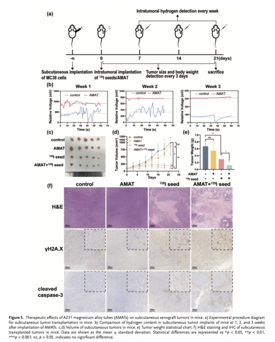 關(guān)聯(lián)療效機(jī)制:高氫氣濃度期(第1–2周)與顯著抑瘤效果(圖5c-e)同步,證實(shí)氫氣是增敏放療的關(guān)鍵因素。