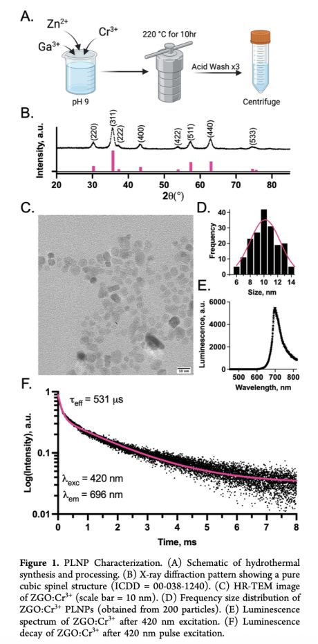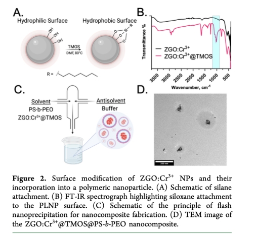 合成與改性PLNPs:水熱法合成ZnGa?O?:Cr3?(ZGO:Cr3?)納米粒子,并用三甲氧基(辛基)硅烷(TMOS)進行疏水改性(圖2A-B)。
