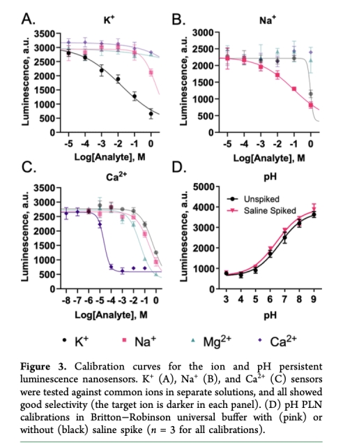K?、Na?、Ca2? PLNs的選擇性(log KK,Na = -2.1, log KNa,K = -1.1, log KCa,Mg = -3.2)和動態(tài)范圍(覆蓋血清濃度)。