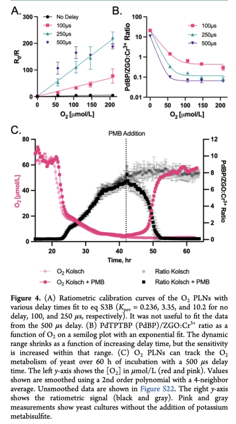 酵母O?代謝監(jiān)測:O? PLNs結(jié)合500 μs延遲,實時跟蹤釀酒酵母的O?消耗及代謝抑制(圖4C)。