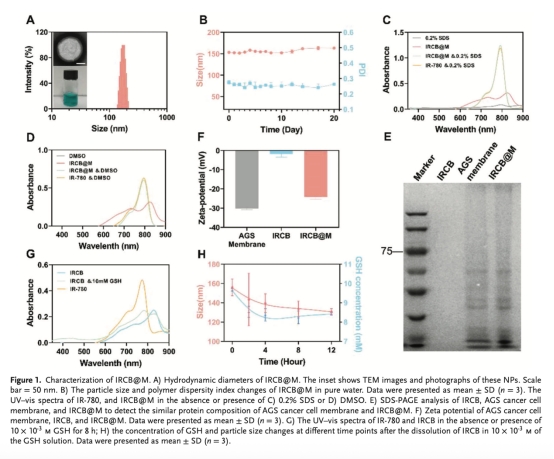 尺寸、電位、UV光譜、TEM形貌:證明IRCB@M成功制備且穩(wěn)定(圖1A-B, F如下)。