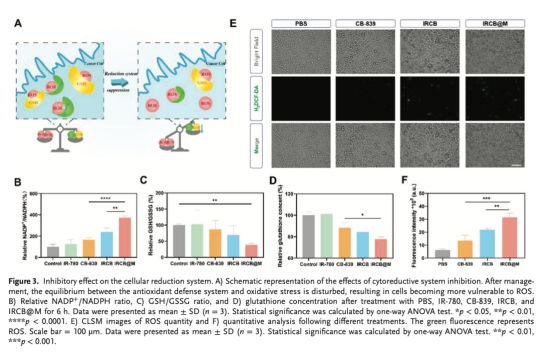 IRCB@M通過(guò)阻斷谷氨酰胺代謝,同步實(shí)現(xiàn)"節(jié)氧"(減少腫瘤耗氧)和"耗竭還原物質(zhì)"(降低GSH/NADPH),雙重增強(qiáng)PDT的ROS殺傷效率。