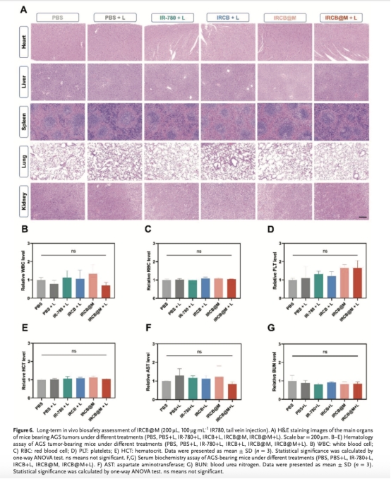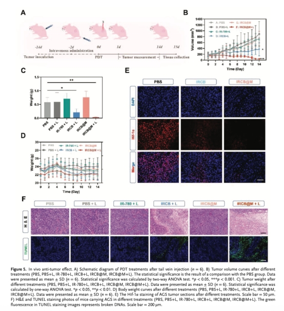 腫瘤體積/重量抑制:IRCB@M+激光組效果最優(yōu)(圖5B-C如下)。