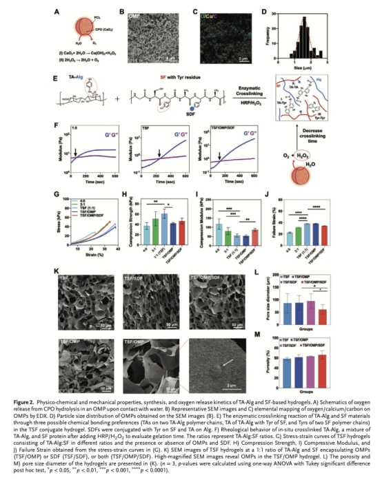 測試水凝膠的機械性能(壓縮模量、粘附性)、孔隙結(jié)構(gòu)、降解行為、氧氣/H?O?/SDF釋放動力學(xué)(圖2F-M,圖3A-G)。