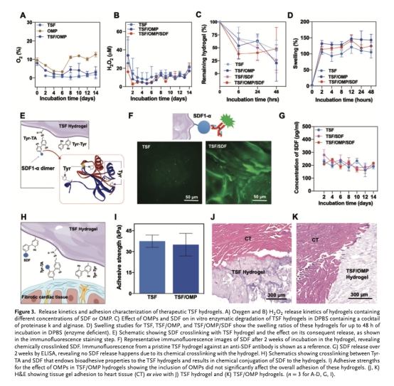 材料性能成功實現(xiàn):開發(fā)的TSF/OMP/SDF水凝膠具備優(yōu)異的機械強度(≈55.8 kPa)、組織粘附性(圖3I)及緩釋特性(氧氣維持<5%低氧水平14天,SDF化學(xué)錨定)。