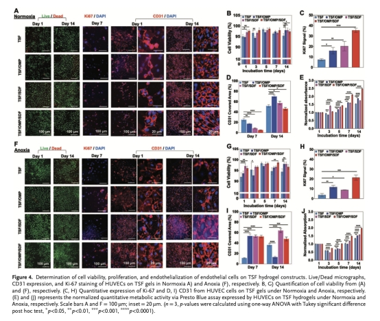 HUVECs存活與內(nèi)皮化(圖4B,D,G,I):在缺氧條件下,TSF/OMP/SDF顯著提升細胞存活率(>90%)和CD31表達。意義:證明水凝膠在缺氧微環(huán)境中促進血管生成。