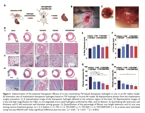 顯著體內(nèi)療效:在大鼠MI模型中,該水凝膠使血管密度增加75%,心肌細胞凋亡率降至<5%,纖維化面積減少,最終改善心功能(EF↑≈25%)。