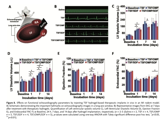 心功能(圖8C-E):治療后7天,TSF/OMP/SDF組射血分數(shù)(EF)提高≈25%,左心室收縮功能改善。意義:直接證實治療策略改善心臟泵血能力。