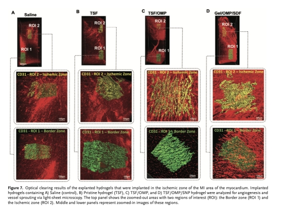 三維血管網(wǎng)絡(luò)(圖7):光片顯微鏡顯示TSF/OMP/SDF組血管分支增多、結(jié)構(gòu)有序。意義:直觀驗證血管新生效果。