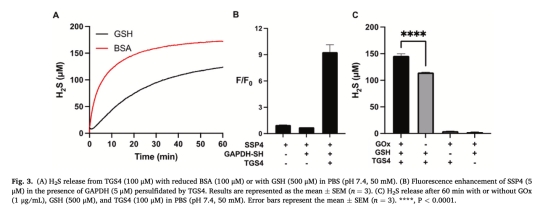 意義:證明TGS4是高效的H?S供體,尤其在生理濃度GSH(mM級(jí))或蛋白質(zhì)硫醇(BSA)存在時(shí)釋放更顯著,為理解其在生物環(huán)境中的行為提供依據(jù)。