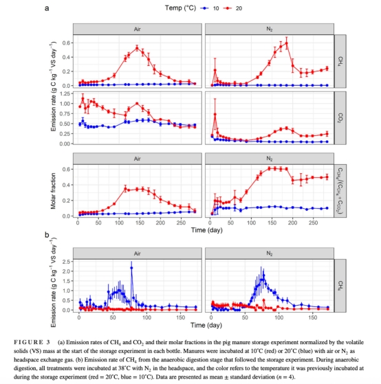 儲存實驗:豬糞在10°C或20°C下,分別暴露于好氧(空氣)或厭氧(N?)環(huán)境283天,監(jiān)測CH?和CO?排放。