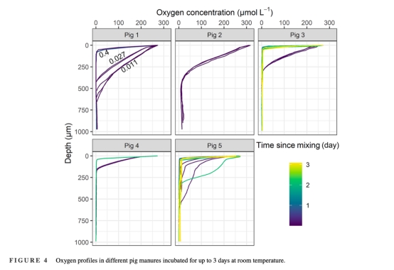 使用丹麥Unisense微電極測量5類豬糞的溶解氧梯度,擬合O?消耗動力學(xué)參數(shù)(r???和K??)。