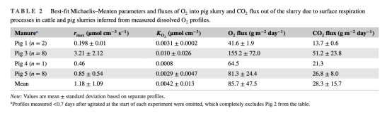 揭示變異性:不同豬糞的呼吸速率差異顯著(如Pig 3的CO?通量51.2 g m?2 day?1 vs. Pig 1的13.7 g m?2 day?1),反映了糞便組成(如干物質(zhì)含量、微生物群落)對表面呼吸的影響,指導(dǎo)模型需考慮糞便異質(zhì)性。