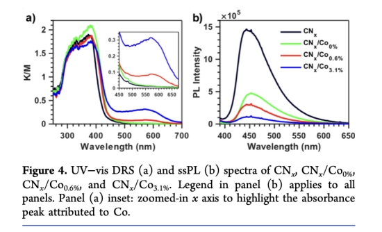最佳鈷負(fù)載量(0.3-0.6 wt%)使CNx在可見光(405 nm)下以葡萄糖為犧牲劑的產(chǎn)氫表觀量子產(chǎn)率(AQY)提高一倍(達(dá)~3%)。