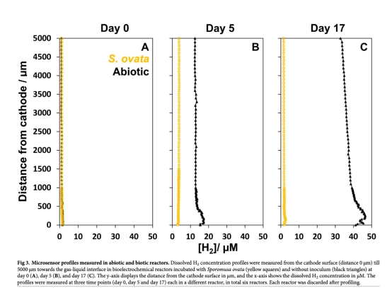 揭示微生物代謝機制:證實 S. ovata 能高效消耗陰極產(chǎn)生的H?,維持液相極低H?濃度(<4 μM)(圖3),支持其通過H?介導(dǎo)的電子傳遞機制驅(qū)動微生物電合成(MES)。