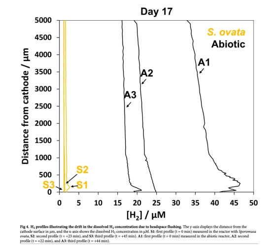 高分辨率動態(tài)監(jiān)測:Unisense微傳感器以25 μm步進分辨率捕捉陰極附近H?梯度(圖3),首次直接證實 S. ovata 在陰極表面高效消耗H?(濃度始終<4 μM),而傳統(tǒng)GC僅能檢測頂空氣體,無法反映液相微環(huán)境動態(tài)。