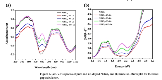 鈷摻雜通過Co2?取代Ni2?位點(diǎn)擴(kuò)大NiTiO3晶格,降低帶隙(≤5% Co),增強(qiáng)紫外光吸收。