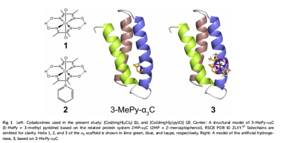 研究對象:基于全新設(shè)計(jì)的三α螺旋蛋白(a3C)和鈷基催化劑(鈷肟,cobaloxime)構(gòu)建的人工酶。
