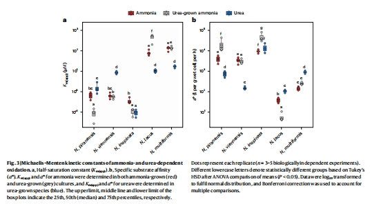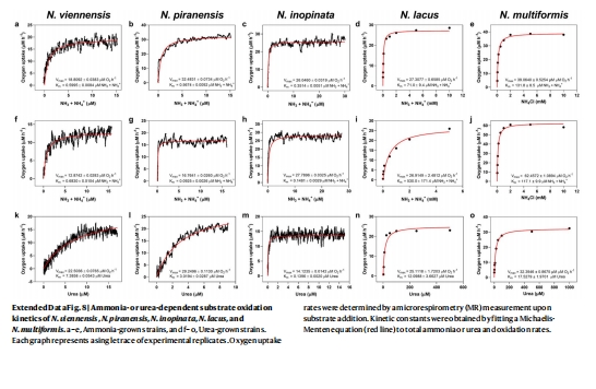 數(shù)據(jù):微呼吸儀(Unisense電極)測定氨/尿素氧化的米氏常數(shù)(Km(app))和比親和力(a°)。