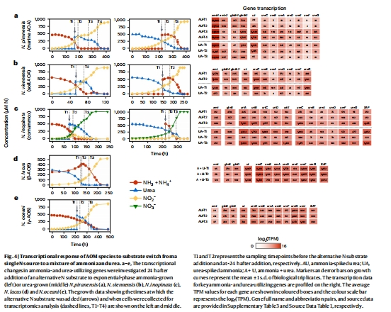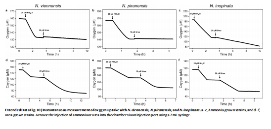 AOA(N. piranensis, N. viennensis)和comammox(N. inopinata)先耗盡氨后才利用尿素(存在雙峰生長)。