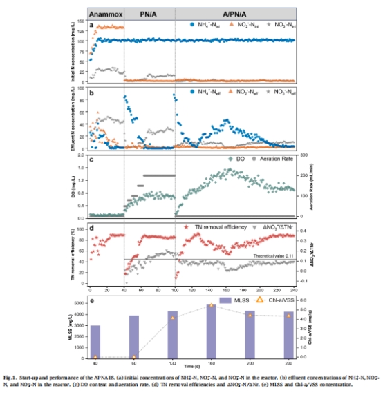 揭示藻類生長(Chl-a/VSS↑)與DO的關(guān)系(圖1c,e):藻類過厚(>160天)導(dǎo)致光限制,DO↓影響AOB活性;攪拌優(yōu)化后恢復(fù)穩(wěn)定。