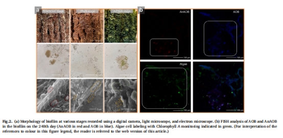 數(shù)據(jù):顯微鏡/SEM形態(tài)、FISH微生物空間分布(AnAOB內(nèi)層、AOB中層、藻類外層)。