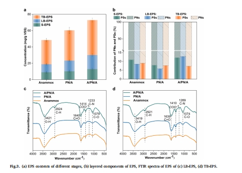 數(shù)據(jù):EPS含量(蛋白質(zhì)/多糖)、3D-EEM熒光峰、FTIR官能團(tuán)。
