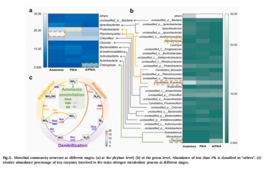 功能基因:hzs/hdh(anammox)、amo(AOB)、Glt(藻類同化)協(xié)同脫氮(圖5c)。