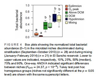 方法:在西班牙酸性水庫(El Sancho,pH 3.5–4.5)的分層期(stratification)和混合期(mixing),同步分析浮游細菌的分類組成、豐度及單細胞特征。