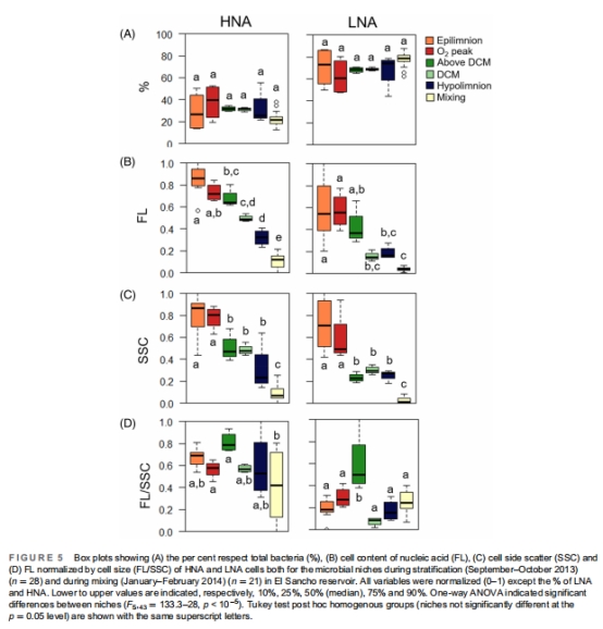 HNA/LNA比例穩(wěn)定(~30%/70%),但絕對豐度和單細胞特征因生態(tài)位而異(圖4, 5)。