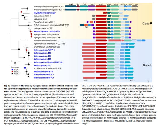 分析1,200+個(gè)甲烷氧化菌基因組,發(fā)現(xiàn)來自Pseudomonadota、Verrucomicrobiota和Gemmatimonadota門的菌株含clade I/II nosZ基因(圖1,補(bǔ)充數(shù)據(jù)集1)。