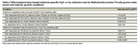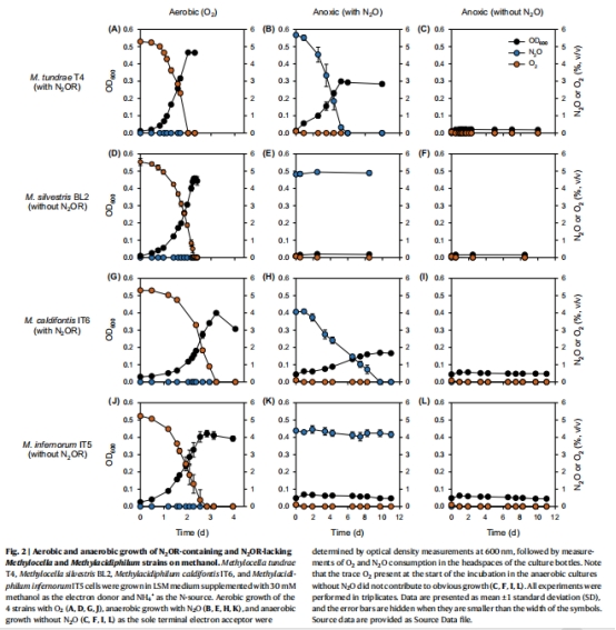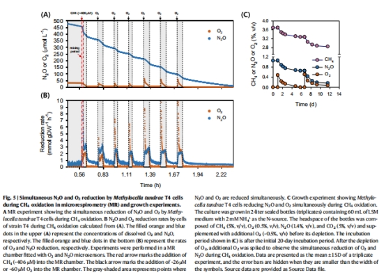 Methylocella tundrae在低氧條件下同時(shí)消耗CH?和N?O,其N?O還原酶(N?OR)在O?存在時(shí)仍保持活性。