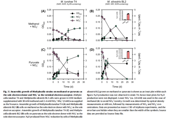 選擇含完整nos操縱子的菌株(M. tundrae T4和M. caldifontis IT6)進(jìn)行厭氧培養(yǎng),以甲醇、丙酮醇、丙酮酸或H?為電子供體,N?O為電子受體(圖2)。