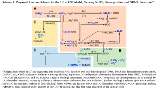 研究背景:飲用水氯胺消毒中,二氯胺(NHCl?)分解通過活性氮物種(RNS)途徑產(chǎn)生N-亞硝基二甲胺(NDMA)等消毒副產(chǎn)物(DBPs)。關(guān)鍵中間體包括