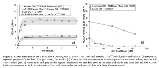 NDMA形成動力學(xué) 圖1a, 圖S4 驗證NDMA通過ONOO?形成:低DO時NDMA↓75%;尿酸清除ONOO?后NDMA↓至檢測限以下(圖1b)。