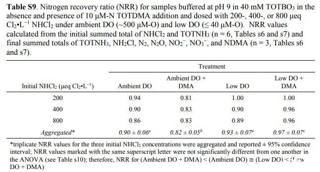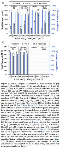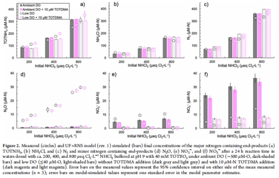 核心發(fā)現(xiàn):在pH 9條件下,量化了不同溶解氧(DO)水平(環(huán)境DO ~500 μM-O vs 低DO ≤40 μM-O)下NHCl?分解的終產(chǎn)物(N?、N?O、NO??、NO??、NDMA