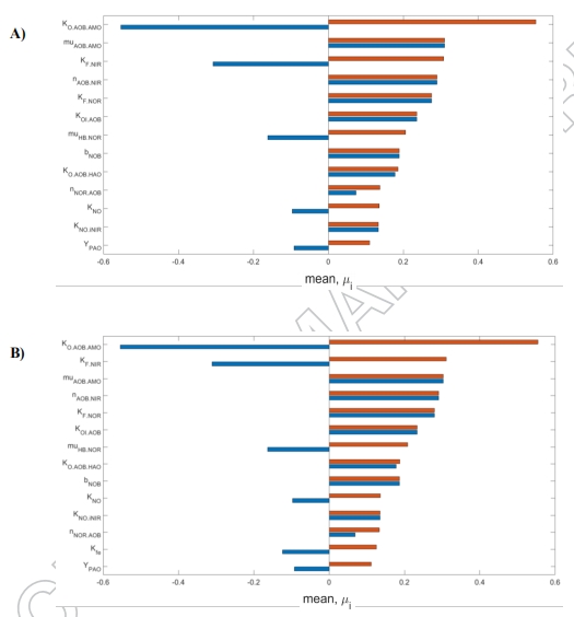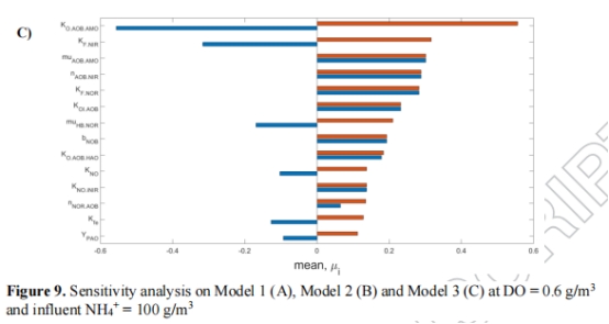 敏感性分析(圖9)表明:AOB相關(guān)參數(shù)(如KO.AOB.AMO、μAOB.AMO)主導(dǎo)排放,且不受傳質(zhì)模型選擇影響。但傳質(zhì)模型誤差可能導(dǎo)致生物參數(shù)校準(zhǔn)失真(Section 4)。
