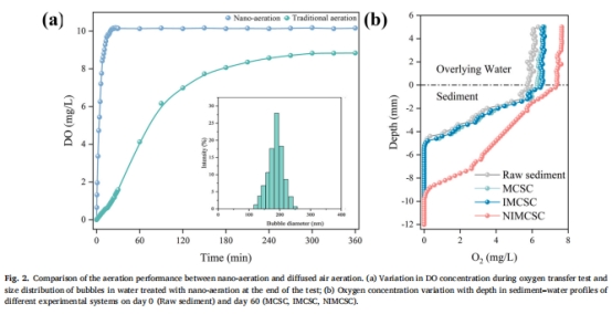 直接證明納米氣泡穿透沉積物能力:納米氣泡(平均直徑184.12 nm)因高拉普拉斯壓力快速溶解釋氧,突破傳統(tǒng)曝氣無法氧化深層沉積物的限制。