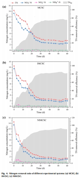 NIMCSC系統(tǒng)TN去除率89.75%(出水TN=1.49 mg/L),較IMCSC(82.29%)和MCSC(75.68%)顯著提升。