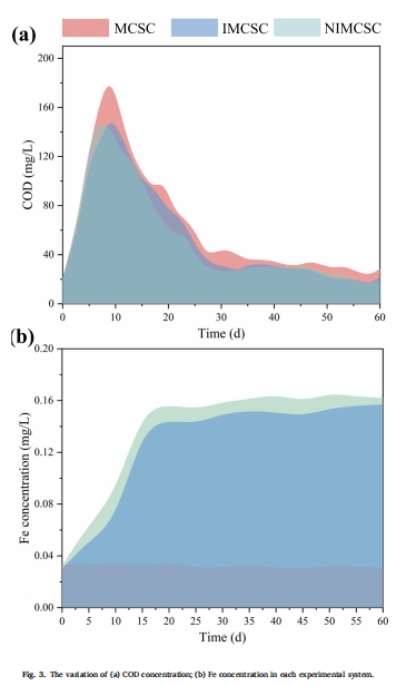IMCSC/NIMCSC的COD穩(wěn)定在17–19 mg/L(達(dá)標(biāo)排放),F(xiàn)e2?緩釋(0.126–0.137 mg/L)提供電子供體。