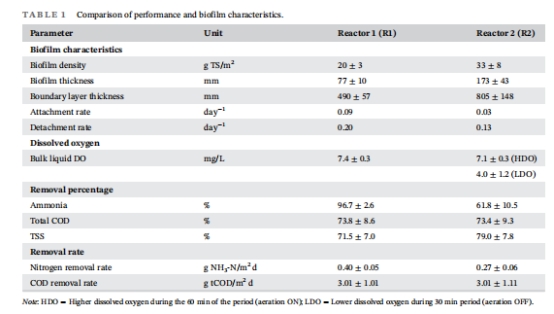 生物膜密度 20 ± 3 g TS/m2 33 ± 8 g TS/m2 密度影響COD降解效率(高密度生物膜對COD去除更敏感)。