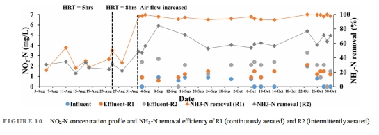 NO?-N濃度(圖9) R1的NO?-N積累更高(硝化完全),R2因間歇曝氣部分反硝化。
